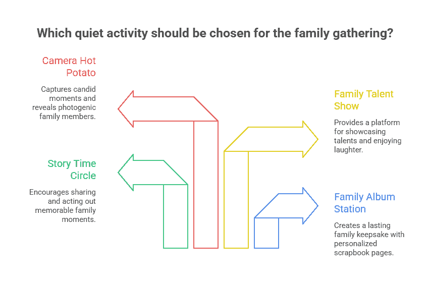 Not every game has to involve running or shouting. For quieter moments, set up creative or sentimental activities that let everyone contribute.
